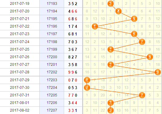 上期的开奖号码是331,百位上开出了一个3号球。结合近期的百位走势图分析,目前3号球已经连开2期,在近期为数不多的连开号码中有一定的地位,而目前过多的连开不适应走势前进,本期不看好3号继续开出;5号在中间的位置上,已经走过了比较长时间的遗漏了,2点振幅位置在近期并不流行,本期可杀5号;7号球近期走势比较有规律,出号不紧不慢的,本期不看好7号出现。