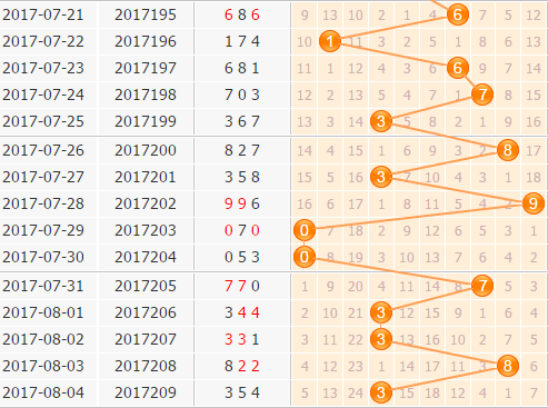 上期的开奖号码是354,百位上开出3号球,从近期百位的奇偶走势来看,奇数号码开出明显要比偶数强势很多,而且可以看到每次奇数号码一开都有连开,本期也关注奇数号码的连续开出。3号球近期重复开出的几率很高,本期关注3号球;7号球近期回暖明显,本期看好7号球;5号球作为一个大冷号,本期也可以关注一下。