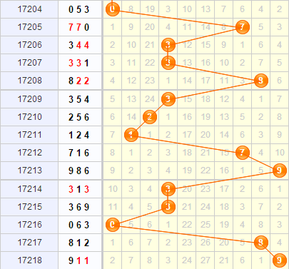 上期开出号码911,百位出号9号,从百位上的走势来看,目前号码走在大数区域内,上期开出了邻码9号,目前7号位置最为可疑,已经连续有2期间隔6期出现了,连续的规律性巧合很难维持太久,本期7号就不看好了;回到小数上面,热号3号在近期断断续续出号不少,间隔期中4号出现较多,本期不看好3号开出;0号目前号码总体走冷,出号间隔期数在10期以上,本期看淡0号。