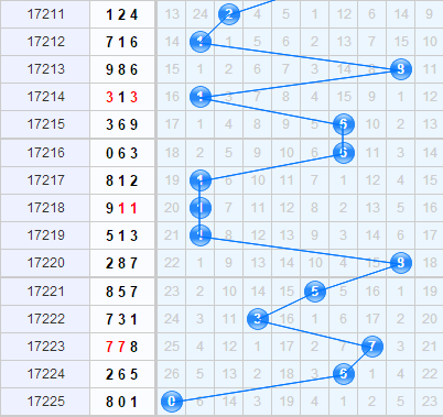 十位上期开出0号,从十位上的走势图来看,邻码在近15期出现了一次,在其他情况下鲜少开出,因此1号球在本期虽说有几率,但是也不高,而且纵观1号球的走势,目前还不适宜出号;3号在十位上近期没什么野心,出号频率相当的低,基本作为冷号开出,因此本期3号也可排除;而近期大振幅连续出现的情况出多,多为交替开出,因此本期应该趋于小振幅,因此7号球可杀。