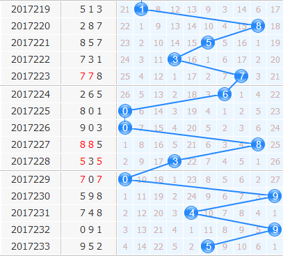 十位上期开出5号,从十位上的走势图来看,0号近期从热号正在向温号发展,大热之后必然面临走冷的危险,本期0号可首先杀掉;1号自从连开3期再也没有出过号,目前持续遗漏14期,整体状态不佳,本期不看好1号开出;从近期十位号码的走向来看,多是大小振幅之间来回的拉动,邻码的出场率相当低,因此推荐杀掉邻码位置的6号球。