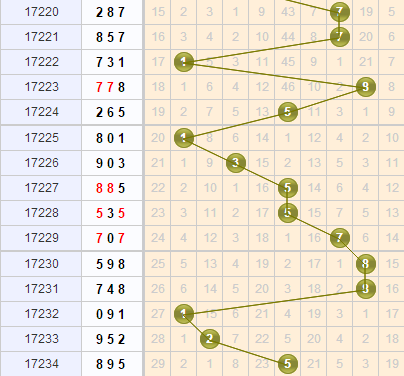 上期开奖号码为895,个位开出5号球,本期结合个位上的走势来分析,目前走势明显有一个规律,这几期出号划分为冷号和热号交替开出,因此现在也导致了号码的两极分化严重,上期热号5号再次出动,那么本期重点关注到冷号上面,尤其是目前来说已经遗漏了20几期的冷号,推荐看好0号、4号和6号;此外热号5号本期继续要小心它连开出现。