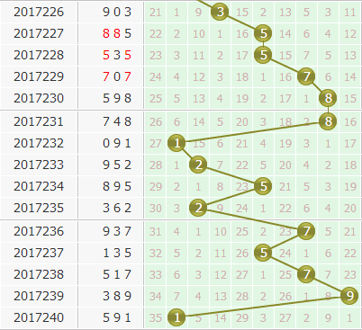 上期开奖号码为591,个位开出小数1号球,本期结合个位上的走势来分析,上一期大数在4期连开之后终于被小数再次阻止,现在小数已经严格控制大数的连开期数的扩展,下一步预计会接着蚕食大数仅剩的力量,当力量耗尽之后,就是小数的天下了,小数重点看好邻码上的0号和2号;已经遗漏了29期的4号可近期补位;另外6号已经遗漏了很久了,按照振幅走向,本期出号希望有的。