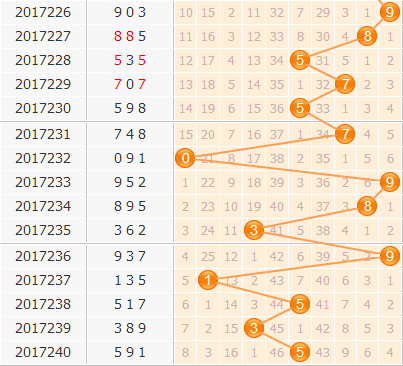 上期开出号码591,百位上开出了5号,从百位上的走势来看,虽然5号在上期又隔期开出了,尽管它出号相对来说比较积极,但是它和之前开出情况一样,能热但是没有连开能力,因此本期5号可杀;5号邻码位置的4号已经持续冷冻了46期,本期继续看淡4号;9号在之前多次出号之后,近期有转温趋势,本期不看好9号球开出。