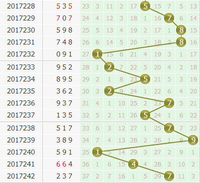 上期开奖号码为237,个位开出7号球,本期结合个位上的走势来分析,0号目前已经沉睡了37期,到现在也没有要苏醒的迹象,所以0号本期继续抛在一边;2号在隔期出号之后又恢复了它之前的走势状态,整体热度再度下滑,而5号在近期频繁开出,到了这几期的出现,中间出号的频率比之前低了,预计接下来热度也不太理想了。