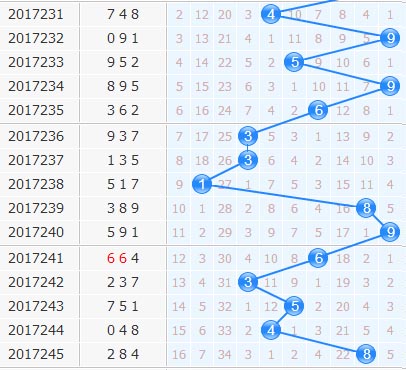 十位上期开出8号球,前期十位出号主要集中在中段位置,上期突然转移叨大号位置,参考之前的8号球走势分析,本期中小跨度号码出号欲望比较强烈,所以太阳风建议大家在选择杀号的时候关注中小号。另外,本期根据十位杀号公式:上期和尾加跨度之和取个位杀本期十位一码:4+4=8