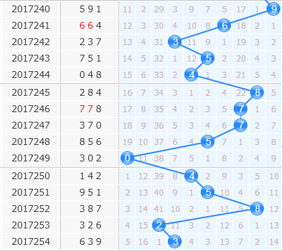 十位上期开出3号,近期十位上号码交错而出,在大数区域内刚刚起步发展两期,很快就被拉回了小数区域内,而且整体走势有继续左移的趋势,因此0号和1号这两码要注意了,另外近期频频出现邻码,很容易带出一个斜连号,本期4号球严防;目前在中部区域内其他号码都多期出号了,只有6号球一直处于遗漏当中,本期6号也可关注一下。