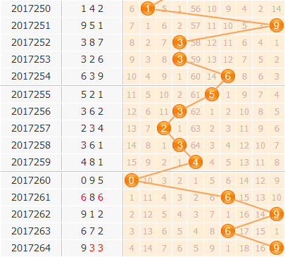 上期的开奖号码是933,百位上开出了一个9号球,结合近期的百位走势图分析,2号位置上由于之前一次已经是大冷号走向,而一次还是走了这条老路,本期看淡2号;6号属于隔期号的位置,但是之前6号已经隔期出了一期了,近期隔期号虽然较为频繁,但是没有连续出过号,因此本期不看好6号再次隔期开出,同时建议杀掉上期开奖号9号。