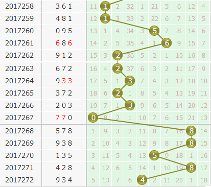 上期开奖号码为934,个位开出小偶数4号球。本期结合个位上的走势来分析,近期个位走向总体偏大,虽然上期开出为小号,但是大号势态强烈,建议关注大号隔期号8。但是近期个位可能有走小趋势,再加上上期的走向为走小,小号中遗漏13期的1号球应当小防一下。0号球是近期个位遗漏期数中等的号码,随着号码走小,很有可能触碰到。近期个位小振幅出现概率极大,4的邻码3以振幅1出现的几率非常大,看好3。