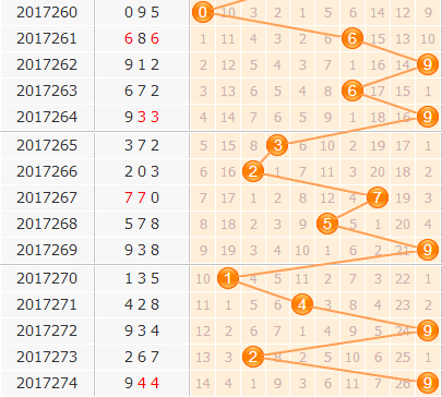 百位上开出了9号,从百位上的走势来看,近期出号的振幅拉动比较大,目前邻码出现的频率比较低,在现在的走势下,首先杀掉9号的邻码8号球;1号按照之前的走势起码还要冷个几期才会出现,而2号也在隔期号上,而近期振幅中已经有过连开2期相同大振幅的情况了,3期连开的可能性很低,本期2号可杀。