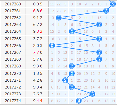 十位上期开出4号,从近期十位走向来看,近期号码主要集中在中段位置上,而且出号的振幅也比较小,重复连开的现象也出现较多,因此目前还没有向两边发展的意向,两个极端位置的号码可首先杀掉,杀掉0号和9号;其中2号球之前的由热转冷,目前很难再热起来,本期2号也可杀。