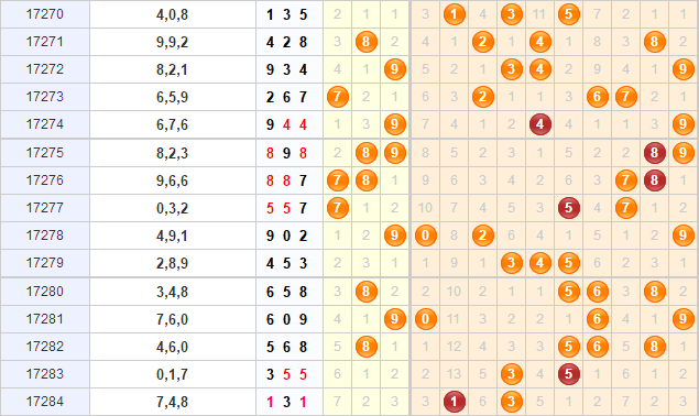 上期开奖号码是131,开出了小小小,奇奇奇的组三形态。从综合走势图上看,0号目前出号活跃性不大,想让1号球带出比较困难;而2号虽然处于1号和3号的邻码位置,但是近期大势处于遗漏阶段,出号的几率不高;6号之前已经连开了3期,还是需要几期好好恢复一下的,而9号热度也开始下降,最近会转为温号,本期不适合开出。