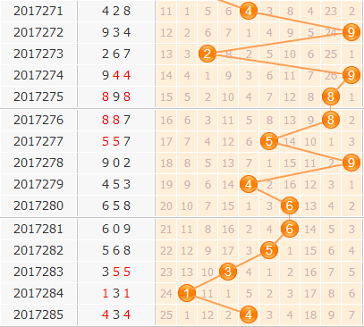 百位上开出了4号,从百位上的走势来看,近期几个号码都交叉而出,小数开始连续出号,并且开出的振幅也比较小,都属于小振幅内开出的范畴,但是近期振幅又一点点在增大,由0点逐次递增到上期3点,因此本期4号邻码位置的5号可杀;另外隔期号在百位上也不受欢迎,因此1号球可杀;9号在大热了一段时间之后,近期逐渐走冷,本期看淡9号。