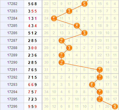 上期的开奖号码是959,百位上开出了一个9号球,结合近期的百位走势图分析,7号近期已经出力太多,在近期不宜继续开出;从走势上看小数前端号码已经被彻底遗忘,其中0号已经沉睡了36期,难以撼动,2号在之前2期连续开出,参考近期2期连开号码之后的走势,都处于较长时间的遗漏状态,本期也不看好2号。