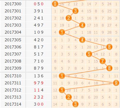百位上期开出了3号,从百位走势上看,在这几期里百位上开出的号码对大数不是特别友好,已经连续3期没有在大数中出现了,目前是小数当道,并且出号比较稳定,其中9号球现在出号频率是越来越低了,在上次出号中间隔期数达到了11期,因此本期不看好9号;在9号隔壁是8号球目前走势也不乐观,在小小回暖一期之后就没有动静了,本期8号可杀;小数上近期重复连开的号码已经很久没出现了,本期不看好3号继续开出。