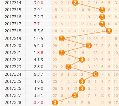 百位上期开出了0号,从百位走势上看,目前从热号接连开出的情况下逐渐有向冷号热出的趋势,在中间位置的热号已经出得差不多了,上期爆出了遗漏了27期的0号球,近期接连有大冷号爆冷而出,本期预计热号在近期不会有过抢眼的表现,首先杀掉4号球;1号在隔期号开出之后一直都在遗漏的状态,甚至比上一次遗漏期数更长,因此本期1号也不看好;另外6号球收到之前大冷号的影响,目前一直没有回暖的表现,本期看淡6号。
