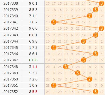 百位上期开出了1号,从百位走势上看,上期大振幅拉动号码又开回了大数区域内,按照近期拉动的规律看,预计本期号码继续留在大数上的可能性较大,因此本期重点杀小号;小号上1号在隔期位置上,而1号球目前出号间隔一次比一次大了,因此本期不看好1号隔期开出;3号在百位上出号并不起眼,前有大遗漏出号的前科在,本期不看好3号开出;8号是上期开奖号,近期8号热度迅速下滑,本期不看好8号连开表现。