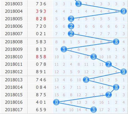 十位上期开出了5号球,从十位走势上来看,号码来回拉动的跨度还是比较大的,目前重点出号趋于在大数区域内,预计本期隔期号码0号出现几率不高,推荐可杀;目前具有连开能力的号码出了2号之外就是9号,上期奖号5号目前在中间位置上,根据近期号码游移的程度看,本期不看好5号继续开出;根据十位杀号公式:上期跨度加和尾之和取个位杀本期十位一码:4+0=4,本期重点推荐杀一码4。