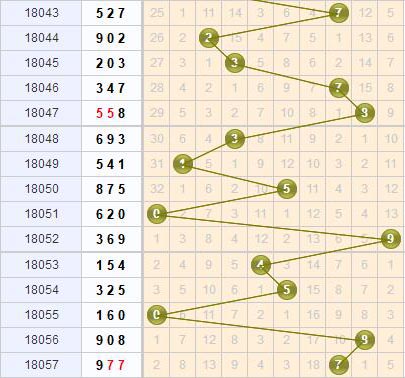 个位上开出了7号球,从个位的走势分布上看,上期7号球最为8号的邻码开出,可以看到个位上近期出产的邻码有不少,但是没有继续组成斜连号出现的,因此本期推荐杀掉6号球;在目前7号最远距离上的0号近期短暂的回补了一次,没有继续走热掀起水花,而是再度沉寂了2期,本期不看好0号再度开出;1号位置自从连开之后一路走势不佳,转冷态势越来越明显,本期看淡1号。