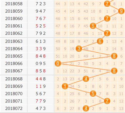 上期的开奖号码473,百位上开出了一个4号球,结合近期的百位走势图分析,上期的4号球属于回补的号码,而近期号码开出的重心明显转移到了冷号上面,接连回补的可能性比较低,考虑到振幅的问题,建议本期杀掉0号;然后在除去邻码的因素,这几期号码虽然出号振幅小,但是邻码始终没有成功登陆,本期可以杀掉3和5。