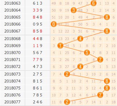 百位上期开出了2号,从近期百位走势来看,上期小数再次绝地反击开出2号,迅速补位的效果比较理想,目前大振幅出现的频率还不是很高,本期再度回到7号球的几率不大,而8号球在2期连开之后没有继续热下去,本期对8号球的期望不大;邻码上虽然在这几期终于出现了一次邻码,不过出现频率依旧非常低,本期不看好冷号3号开出。