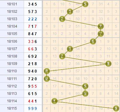 个位上期开出了号码9号,从走势图上看,个位上振幅摆动同样很大,只是不同的是个位上多了连期开出的号码,但是在振幅上明显近期是以大振幅开出为主的,因此同样杀掉9号的邻码8号;另外中间位置的5号球在连开之后和别的2期连开号码一样,都没有回补的表现,因此本期5号建议可杀;最后隔期号在个位上近15期都没有出现过1次,因此建议可杀掉1号。