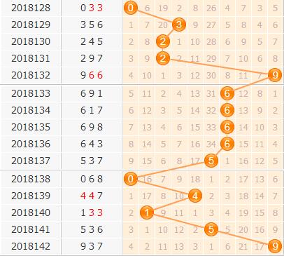 上期开奖号码是937,百位上开出了9号球,1号距离目前号码振幅较大的距离,近期多以4点振幅开出为主,大振幅出现频率低,建议杀掉两个振幅最远距离的号码0号和1号球;大振幅剖析完了转眼看到小振幅,这几期号码中小振幅接连出现,但是邻码,也就是1点振幅,在这10期内只出现过1次,可以说频率相当的低了,因此本期建议杀掉遗漏了17期的冷号8号球。