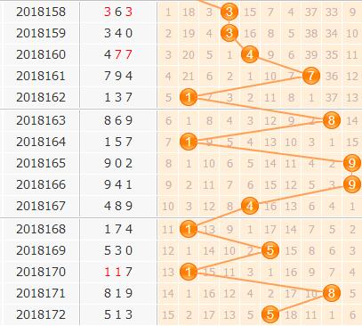 上期开奖号码是513,百位上开出了5号球,从百位走势上来看,目前偏冷的号码依旧没有太多出号的机会,在2号球位置上已经遗漏了17期,走势基本直接带过走向1号,本期不看好2号开出;中间位置的4号球近期有过一个间隔6期的回补表现,目前5期没有开出,还没有到最佳回补状态;8号球目前在隔期位置上,结合它之前的出号表现,本期隔期开出的希望不大。
