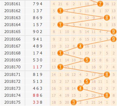 百位上期开出了号码3,从百位走势上看,4号球目前有2期的间隔期,而纵观4号近期的表现,回补在5期以上,热度不算太高,本期不看好4号开出;6号球是百位上遗漏时间最长的号码,并且在大数上一直都受到持续性的冷落,本期看淡6号;8号球目前在隔期位置上,按照目前7号出号能力看,继续走冷的可能性较大。