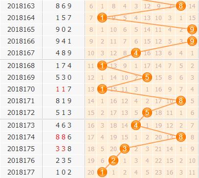 上期百位开出了1号球,从百位走势上来分析,1号球曾经有过多次的走热表现,但是基本都处于隔期出号状态,没有进一步走热的意思,而在热度下滑的6期之后开出,本期继续出号的可能性不大;中间位置的5号球在短暂的回补了一次之后没有继续走热的意思,目前不看好5号开出;9号球经过2期的连开后放逐了自我,走冷态度坚决,本期看淡9号。