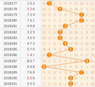 百位上期开出了号码5,上期5号球重复开出,对应近期接连出现的2期连开号码3和7,不过它们在之后的表现中都反响平平,没有延续出号热度,本期建议杀掉5号;0号球在之前的30期中爆冷而出,目前还没有很好的调整状态,近期没有过多的出号意向,本期杀掉0号;8号球由于之前的12期遗漏表明了近期不醉心于走热出号,本期不看好8号球开出。