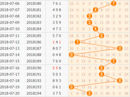 百位上期开出了号码3,从百位走势上看,开出了也是一个冷号,3号球也是间隔了十期才出号,但是冷热号是交替开出的,冷号已经开出,本期就不看好冷号。6号球这个最冷的号码就不用说了,不看好它;4号球在3号球旁边,也是有十期没有开出,也不看好4号球;7号球还是有走冷的趋势,不建议关注。