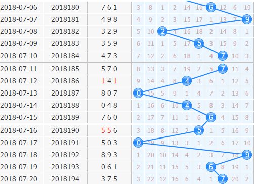 十位上期开出了7号球,奇数号码开出,但是分析十位上的奇偶走势来看,奇数和偶数号码是一期交替的,一期奇数和一期偶数号码的轮流开出,上期开出了奇数号码,本期就要关注偶数号码。近期邻码开出非常频率,6号球和8号球都是两个邻码,本期就看好这两个号码。