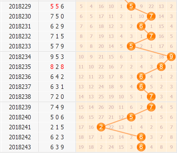 百位上期开出重复号6,这是近期内百位的号码6第二次重复开出了,这也更加增加了百位的中大号走势,所以本期建议大家在选择号码的时候可以继续关注百位开出中大号。另外参考一下近期的出号跨度分析,本期其实中大跨度开出的几率也是有的,小孔明结合号码走势分析,建议大家重点可以关注与喜爱号码1和2的走势,小号里面比较有几率开出的。本期小孔明重点推荐百位胆码:12578