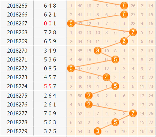 上期百位开出号码3,小号3间隔8期开出,参考前期的号码走势分析,号码3属于比较冷的号码,至少在百位是这样的,本期连续开出的几率不大,不建议大家本期作为胆码关注。小孔明本期结合号码走势分析,预计本期百位走势会继续保持小跨度号码组合,重点关注百位中小号开出,具体推荐百位胆码:12457