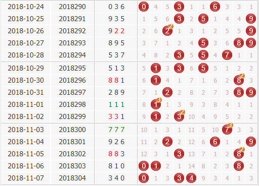 上期开出了号码340,是小小小、奇偶偶的组六形态。结合综合走势图来看,0号球这两期沉寂许久大发神威,3号球近期出号短暂,但是又有复热的现象,加上邻码位置的2号出号规律性强,本期可以看好;6号和7号近期回暖了过来,目前有回补出号的走热趋势,9号球频繁出现间隔3期的表现,本期看好9号。