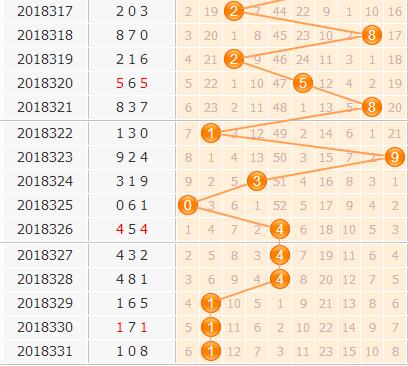 百位上期开出小数4号,结合百位走势来看,小数目前长达8期的连开还是没有停歇下来的意思,走势分布上大部分集中在1号和4号中,反复都有连开表现,除了2号球始终无法顺势开出之外,其他号码近期都还有回补的希望,本期胆码推荐看好0134。