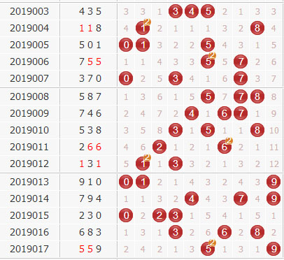 上期开出的是559,组三形态,大大大,奇奇奇。从综合走势图上看,3号目前连续不断出号,每个号码的间隔期都在3期之内,本期看好3号隔期开出;5号上期作为重复号出现,在及时的回暖之后,本期继续期待5号表现;7号是目前大数中近期出号最晚的号码,本期建议小防,上期9号开出,8号是它的邻码,本期盯防8号隔期开出。
