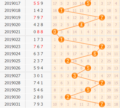 百位上期开出大数7号,结合百位走势来看,7号球现在缩短了出号的进程,从规律性开出间隔4期到上一期表现的2期,频率的增加表示热度的上涨,本期7号继续看好,同时走势拉动下最右侧的9号严密盯防出号;按照目前交替振幅走势来看,回拉力量振幅看目前最大的6点,也就是落点1号,同时中间位置上4号值得盯防。