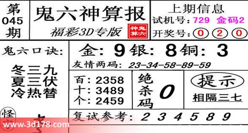 3d第19045期鬼六神算报为您推荐鬼六口诀: