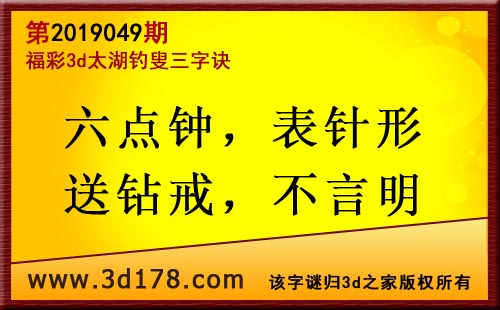 3d第19049期太湖字谜:六点钟,表针形,送钻戒,不言明