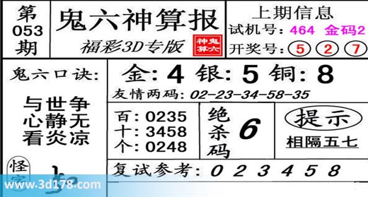 3d第19053期鬼六神算报为您推荐鬼六口诀: