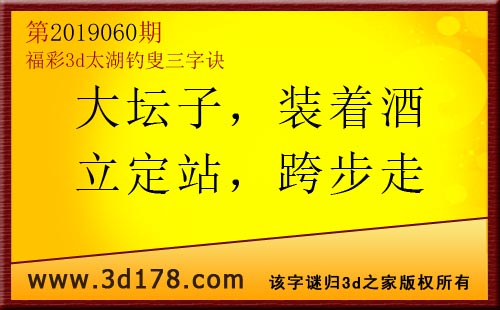 3d第19060期太湖字谜:大坛子,装着酒,立定站,跨步走