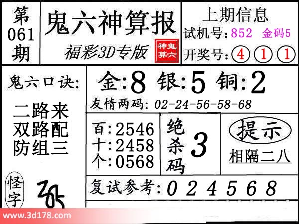 3d第19061期鬼六神算报为您推荐鬼六口诀: