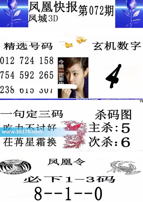 福彩3d凤凰快报图第19072期精选号码推荐: