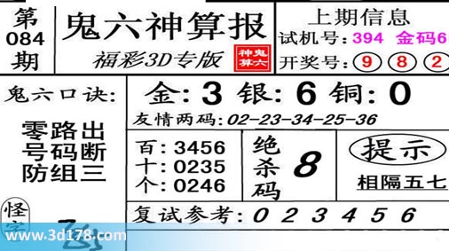 3d第19084期鬼六神算报为您推荐鬼六口诀: