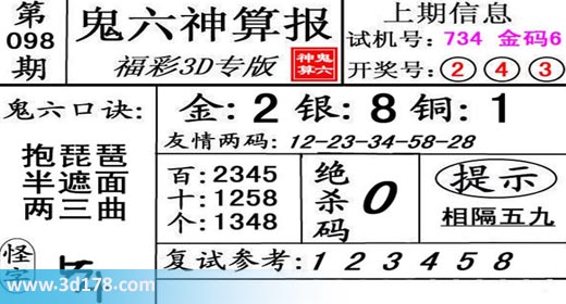 3d第19098期鬼六神算报为您推荐鬼六口诀: