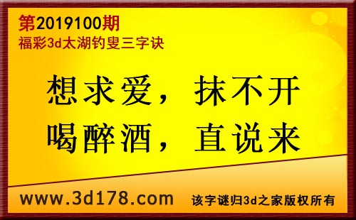 3d第19100期太湖字谜:想求爱,抹不开,喝醉酒,直说来