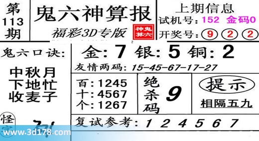3d第19113期鬼六神算报为您推荐鬼六口诀: