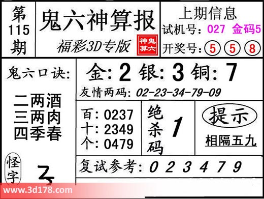 3d第19115期鬼六神算报为您推荐鬼六口诀: